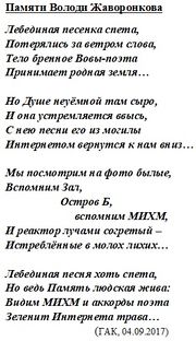 | 22:55, 6 сентября 2017 | Памяти Володи Жаворнкова.jpg (файл) | 71 КБ | Gak | 1 | ||