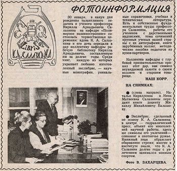 30 января 2019 исполнилось 100 лет со дня рождения ветерана МИХМ и одного из основателей кафедры «Полимерное машиностроение» профессора Кирилла Аркадьевича Салазкина.